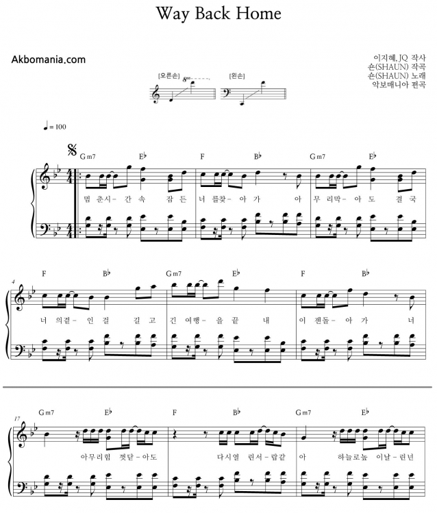숀 way back home 악보. 이 블로그 포스팅을 본인 블로그로 스크랩 하고 3 댓글에 이메일 주소 남겨주시면 24시간이내에 100 바로 보내드릴께요. 모든 악보는 한국 음악 저작권 협회에 등록되어 있습니다. 칵스의 멤버 숀 의 솔로 곡이며 우선적으로. 숀 shaun way back home 피아노악보 영상 재생은 아래 사진을 click 멈춘 시간 속 잠든 너를 찾아가 아무리 막아도 결국 너의 곁인 걸 길고 긴 여행을 끝내 이젠 돌아가 너라는 집으로 지금 다시 way back home 아무리 힘껏 닫아도 다시 열린 서랍 같아 하늘로 높이 날린 넌 자꾸 내게 되돌아와 힘들게 삼킨.