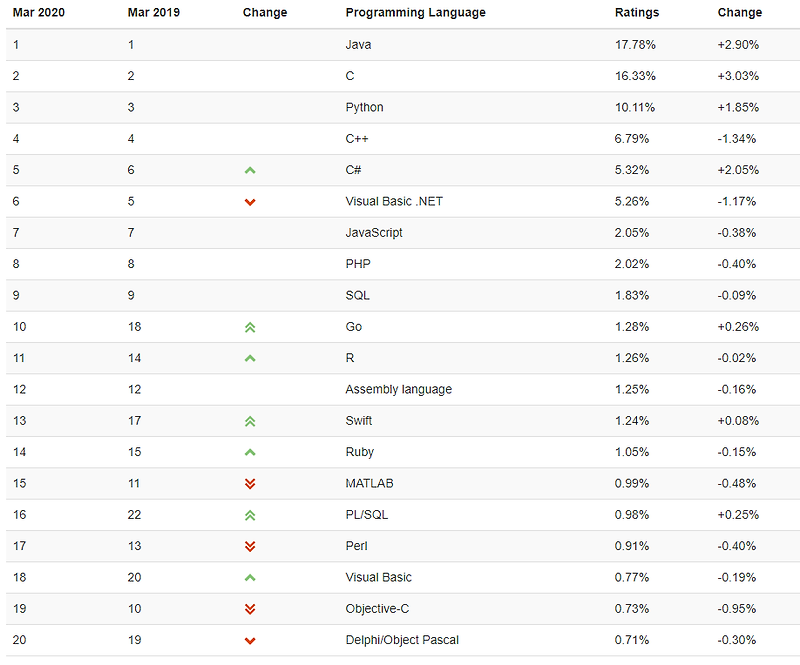 2020년 3월 프로그래밍 언어 순위 및 비교