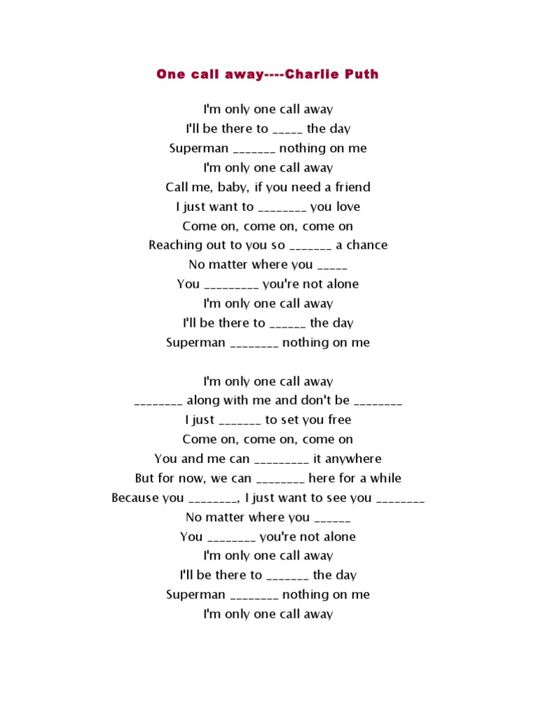 One Call Away By Charlie Puth Close Reading With Song Lyrics Grades 3 6